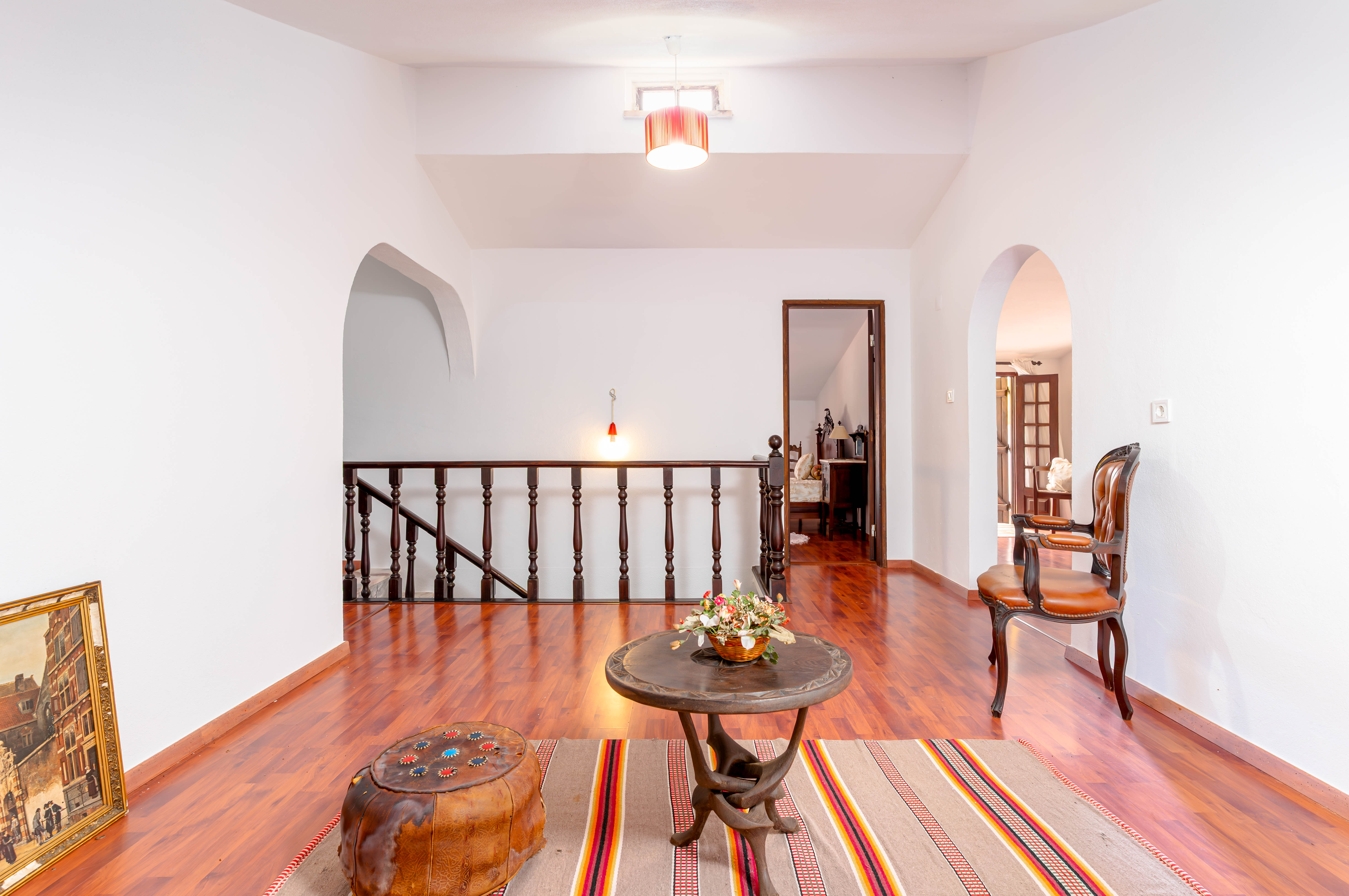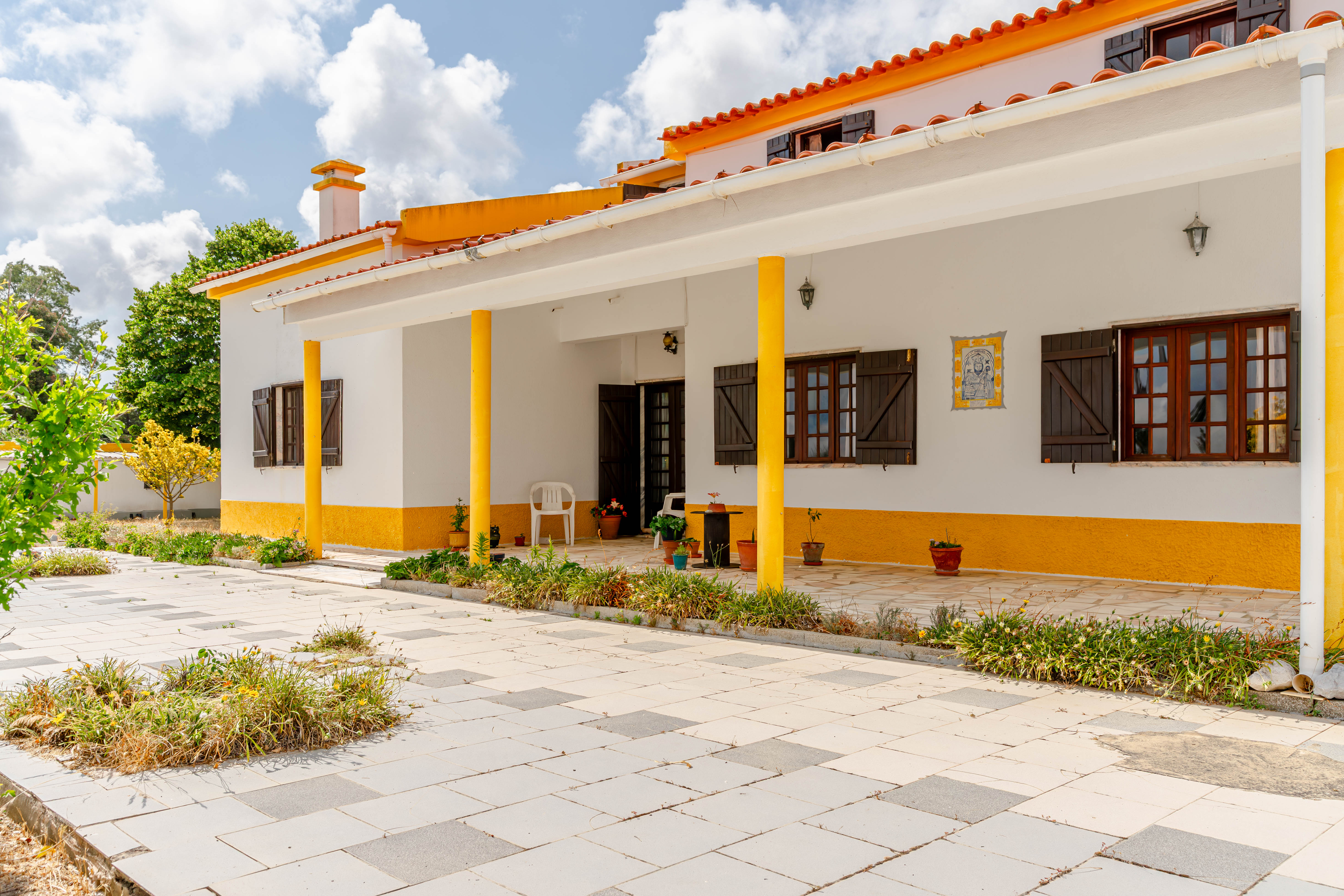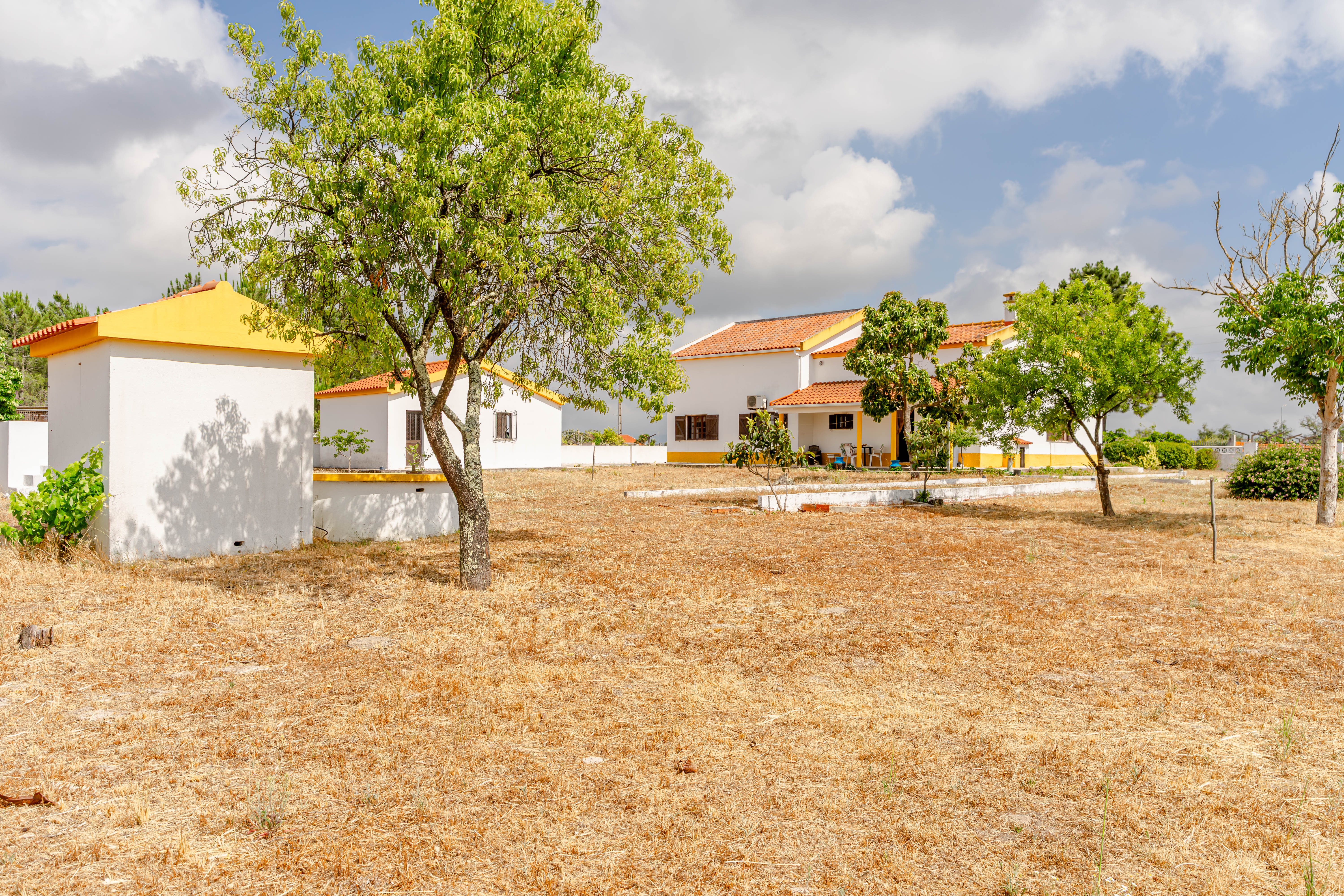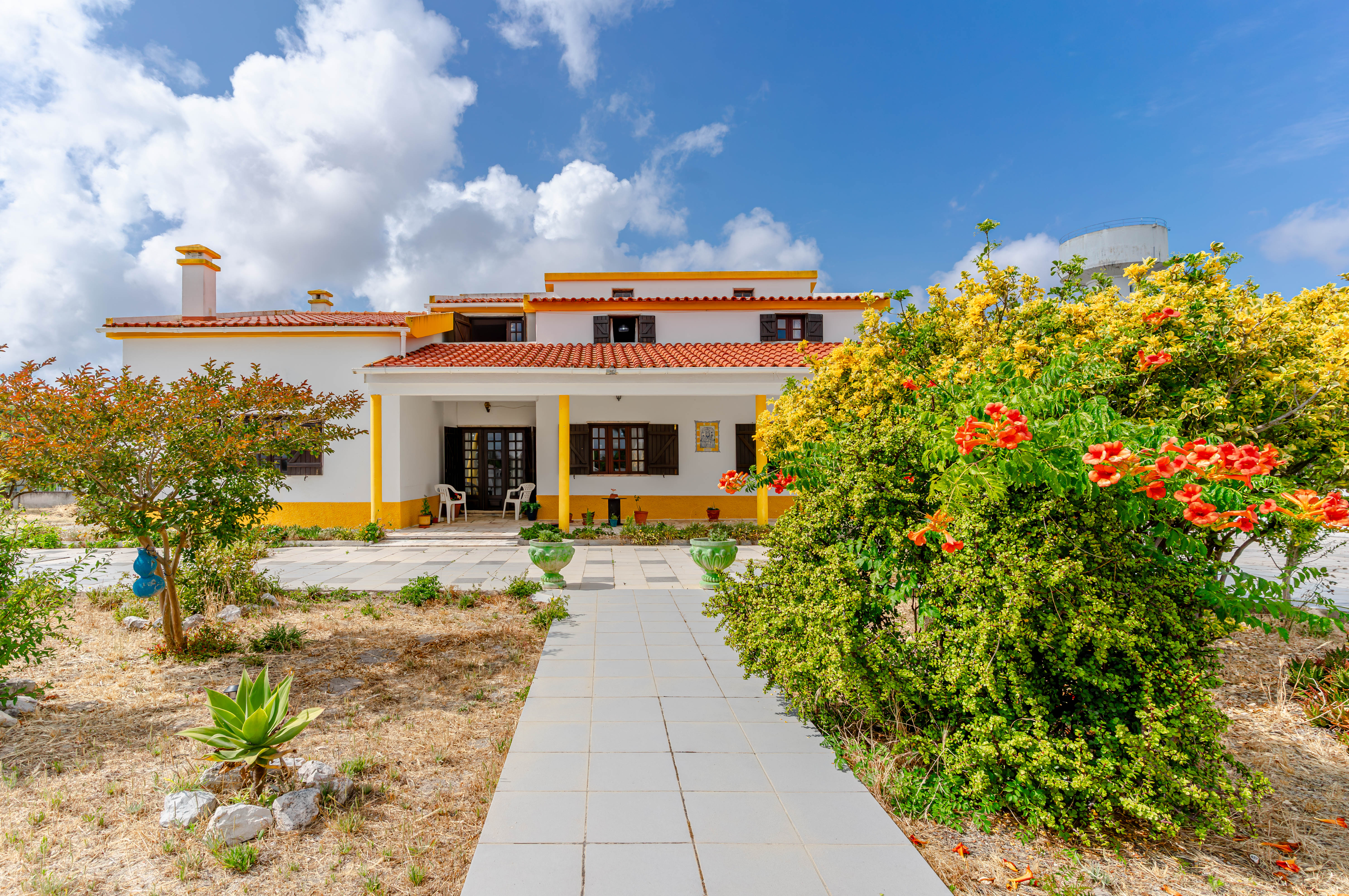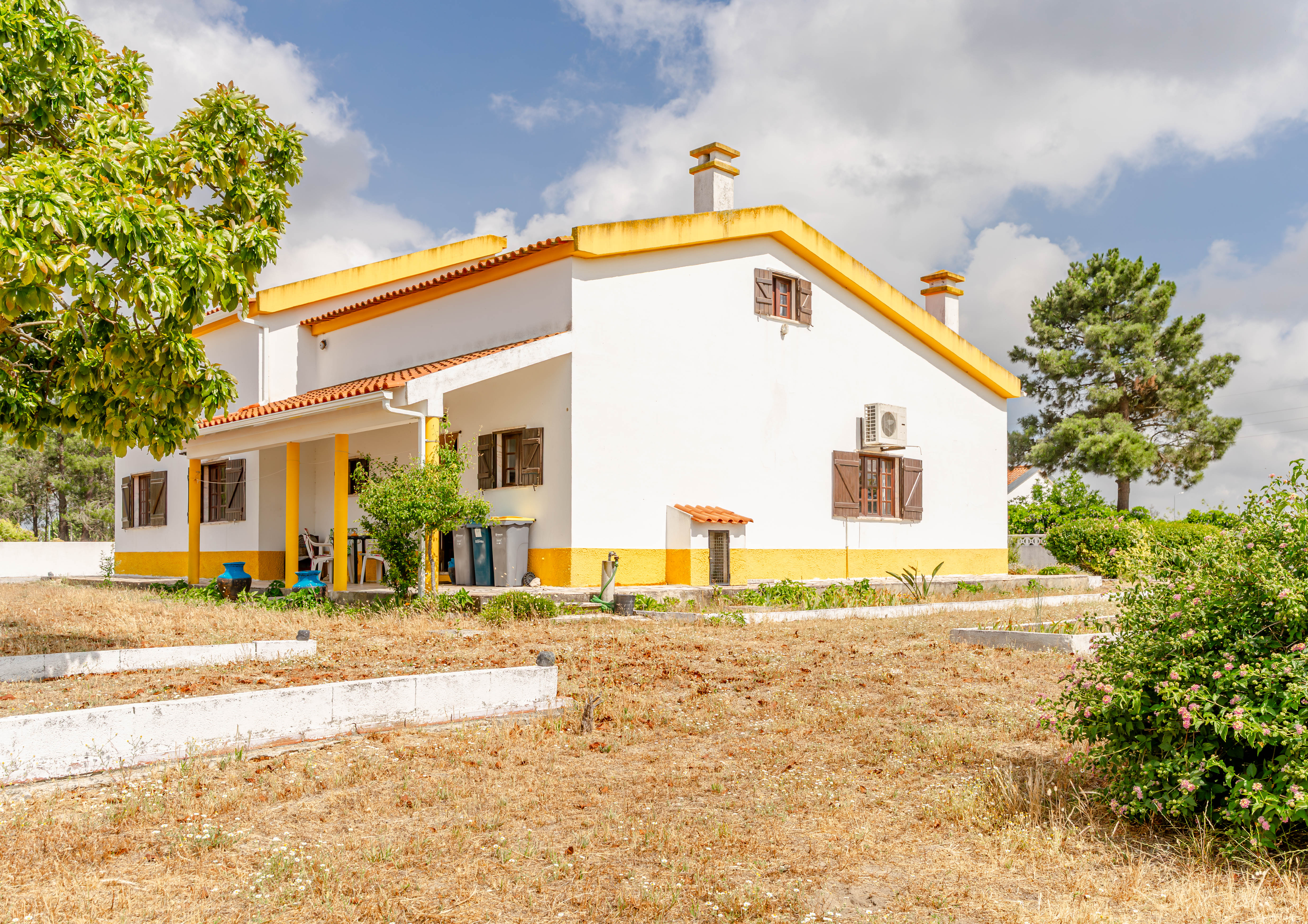 Moradia de dois pisos, implantada num generoso lote de terreno com 5.000m², próxima de Sesimbra, da Lagoa de Albufeira e da Aldeia do Meco.